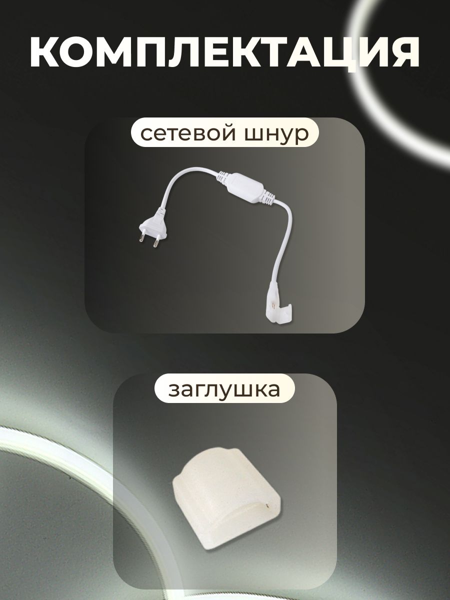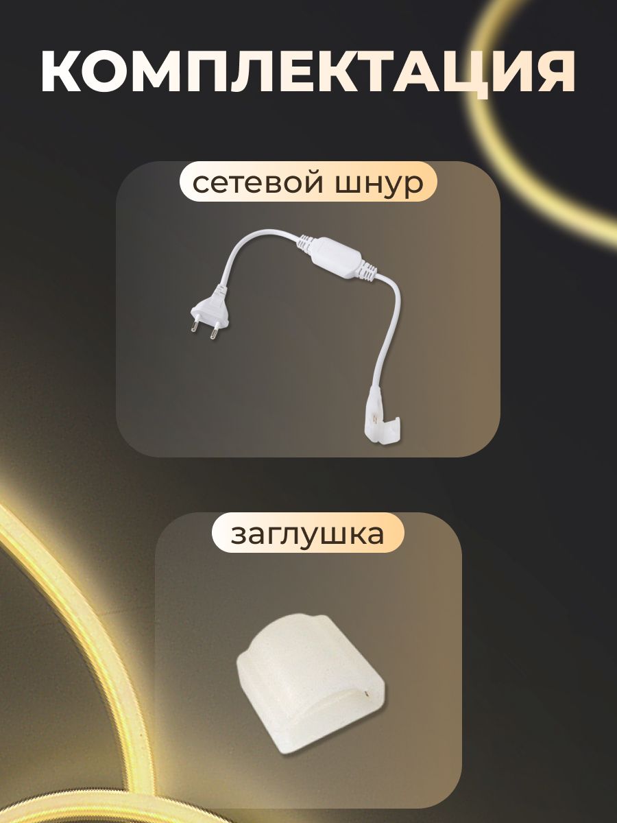 В комплект входит: отрез длиной 5 метров Гибкий неон COB , заглушка, шнур питания с вилкой.