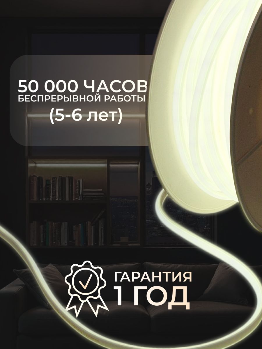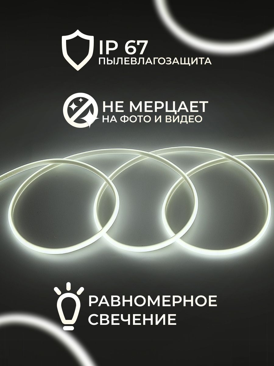 Гибкий неон COB длиной 5 метр герметичная светодиодная лента в усиленной силиконовой подложке Нейтральный белый свечения. Благодаря современным, безопасным и не энергозатратным светодиодам гибкая неоновая лента дает равномерное свечение по всей длине, при этом светодиодная лента не нагревается даже при продолжительной работе и способна выдержать перепады температур от -50 до +50 градусов. Подложка из силикона устойчива к механическим повреждениям и полностью водонепроницаема.